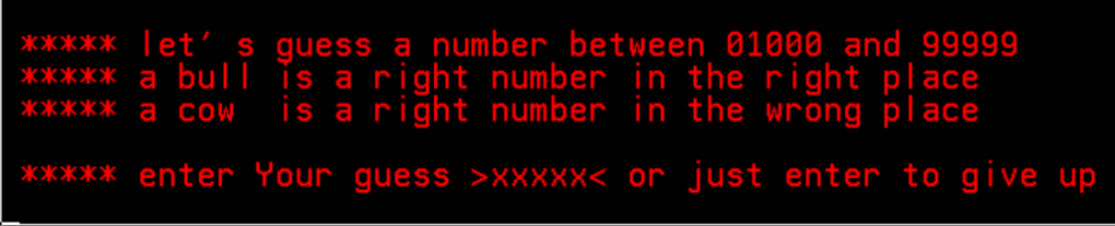 I know it is bit vague to play games on Mainframes .. In case you want to be on mainframe screen and play a game, here is one “number guessing game”.. Currently code generates a random 5 digit number and no repeating numbers in each number. You can modify the code as you need. And this is modified code from this post.